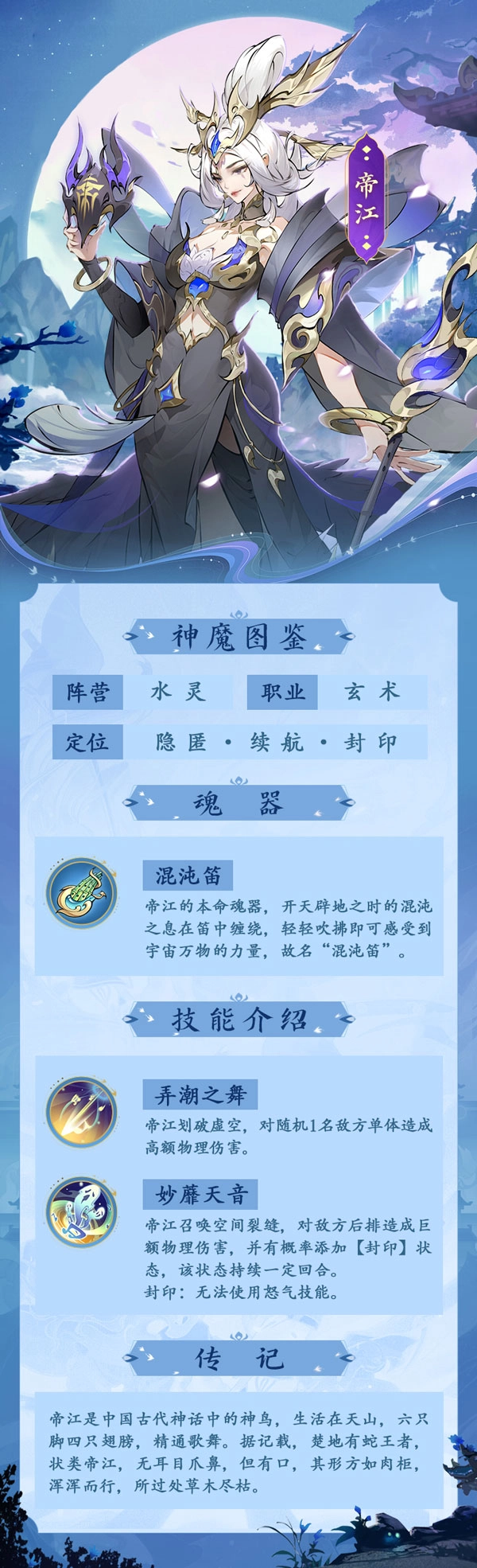 帝江栖居于西方天际,生有两对羽翼,虽无五官却能辨识音声、擅长舞蹈,是为神鸟。