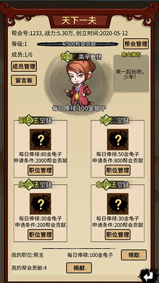 这里可以申请帮会职位,每个帮会除帮主外设有4个可申请的职位,成功获得职位后就能每日领取金龟俸禄!