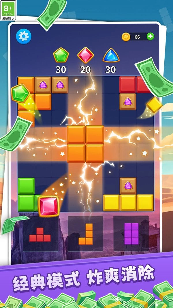 1、在经典模式下,玩家可操控方块完成下落、移动与旋转操作,使相同方块在横向或纵向形成完整的行列,以此达成消除效果并积累分数。