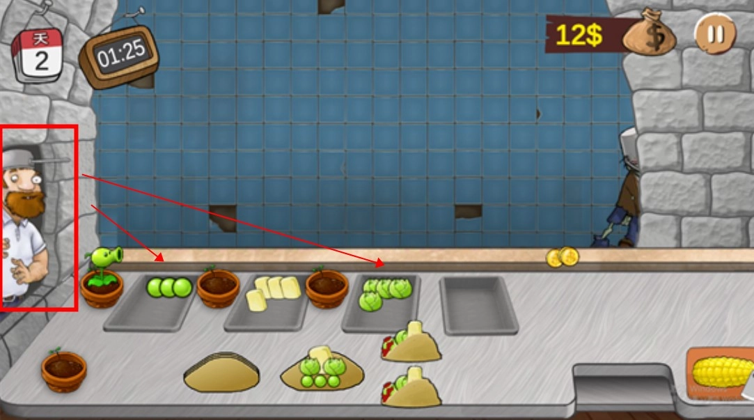 4、玩家要把豌豆、卷心菜、玉米这类植物食材搭配起来制作沙威玛三明治,然后卖给僵尸顾客。在赚取金币的过程中,还得保证僵尸在耐力用完之前拿到沙威玛。