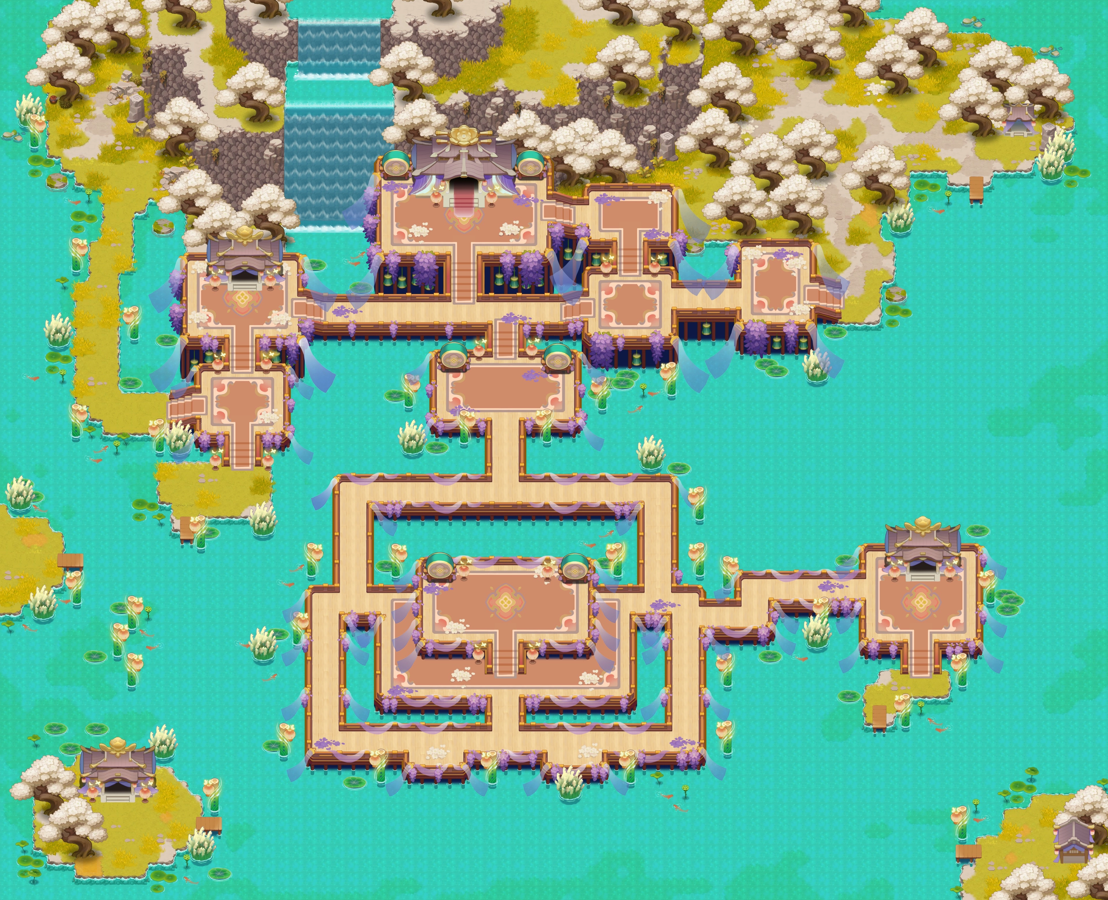 飞白水榭:器乐长老凌音常在此处教导弟子。从飞白水榭往岸边眺望,水畔白色杏林与它的倒影交相辉映,景致格外美丽。