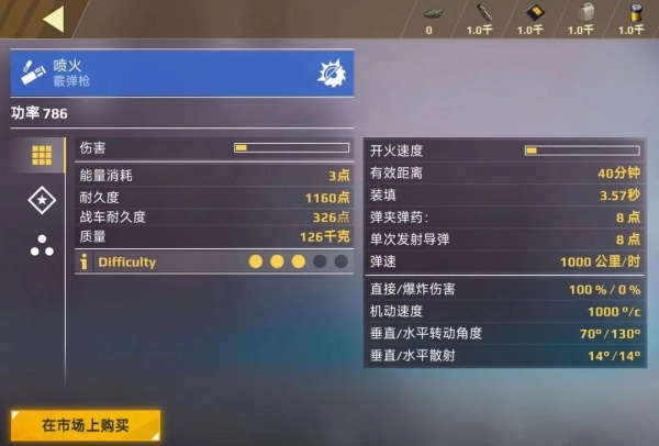 像上图里的“喷火”霰弹枪,它的耐久度比“巨锤”提高到了1160,还有326点的战车耐久度。另外,它的弹夹里装着8发弹药,每次能发射8枚弹丸,单次射击的火力投射能力比“巨锤”提升了33.3%,全弹夹射击的话则提升了166.67%。