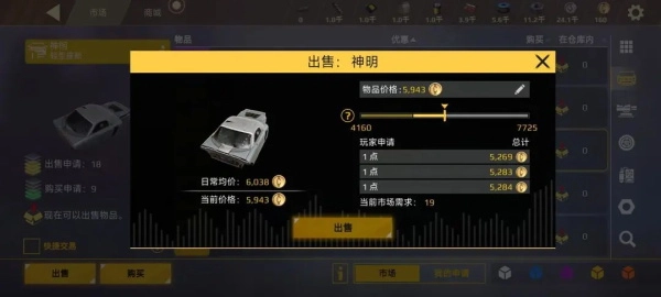 上图中的“神明”图标此刻显示着红色向上箭头,这表明当前可以立即出售一件物品。这时,我们点击“出售”按钮,就会弹出下图呈现的交易申请界面,通过滑动条能够调整我们期望的交易价格,而滑动条上呈亮黄色的交易价格意味着按照该价格提交交易申请会被机器人即时处理。