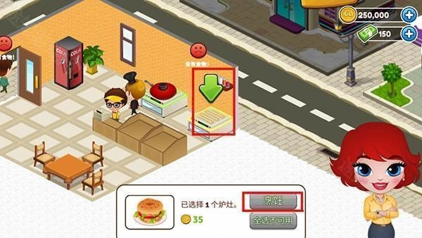 6、每天通过营业来积累金币和经验值,进而逐步升级厨房设备并优化店面布局。