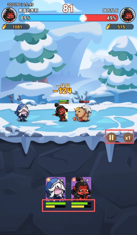 3、屏幕下方能看到每个英雄的血量与怒气条,英雄发起攻击或遭受攻击时都会提升怒气,怒气值满后就会释放技能,玩家还可以设置自动战斗模式,也能调节战斗的倍速。