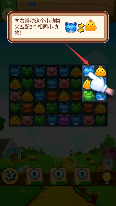 3、滑动屏幕来交换相邻动物的位置,让三个或三个以上相同的动物连成一条线,这样就能消除它们。