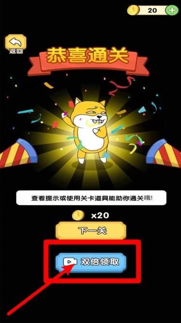 3.通关奖励展示:玩家完成关卡后会看到恭喜通关的画面,此时可以选择观看广告来领取双倍金币奖励,以此激励玩家继续挑战更高难度的关卡。