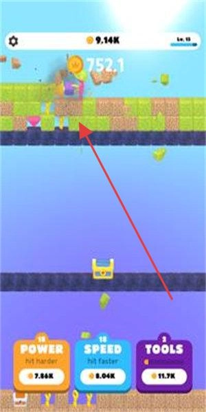 1、控制角色进行方块挖掘,优先选择绿色区域(例如箭头所指位置),通过挖掘积累金币,可用于升级【POWER】等属性,从而提升挖掘能力。
