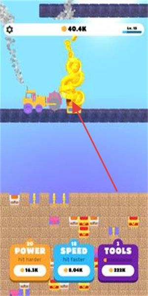 2、碰到金色螺旋币堆(像工程车所在位置那种),要全力去挖掘,尽快获取大量金币,用来升级,提高挖掘效率。