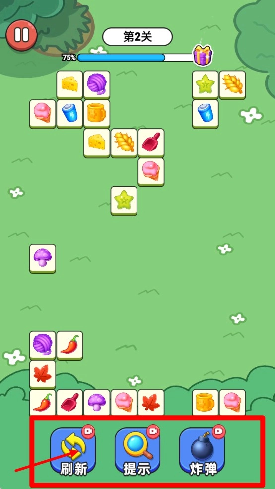 1.下方的功能栏里设有“刷新”“提示”“炸弹”之类的道具按钮,使用这些按钮能够提高通关的效率,或是帮助打破当前的卡顿状态。