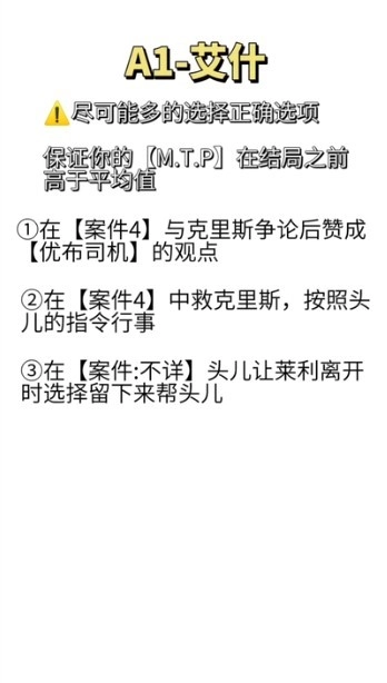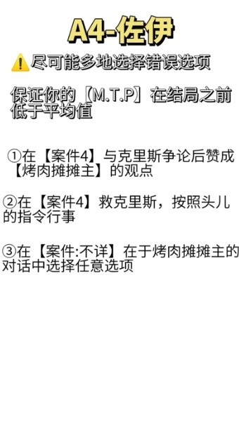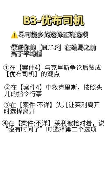 AB分支:在听完他的一番话后,会出现一系列选项。当进行到他掏枪的那个选项环节时,若选择第一条“知道了。”,则会进入A结局;若选择第二条“不对劲”,则会进入B结局(建议通过存档读档的方式快速获取两个结局)。