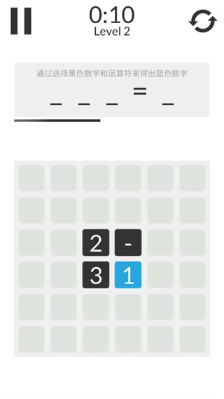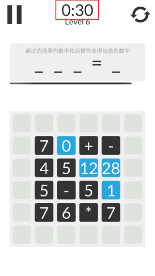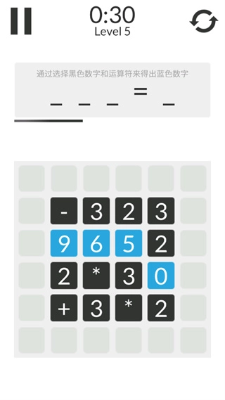 2、游戏中玩家需选择黑色数字与运算符号,通过运算得出蓝色数字即可完成消除;游戏设有时间限制,初始关卡难度较低,旨在让玩家熟悉玩法。