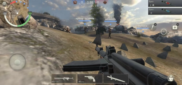 4、游戏分为红方和蓝方两个阵营,就像下图展示的那样,玩家所在的阵营是蓝方,需要和队友协作去攻击对手;红方是玩家的敌人;左侧的按钮用来控制角色的移动。