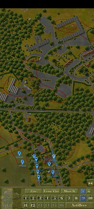 4、从图中能看到,当前局势十分危急。我方剩余的回撤部队已被发现,不过因为身处复杂的丛林环境,并未受到交叉火力的压制。我决定命令他们强行发起进攻,同时调派m5a1提供支援,位于地图最左端的机械步兵则执行迂回穿插任务。由于机械步兵团的位置被遮蔽物环绕,所以无需担心会遭到火力打击。