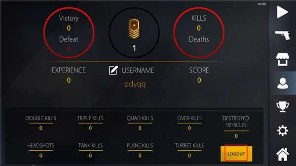 2、接下来玩家需要登录自己的账号才能进入战场,若尚未拥有账号,可点击头像图标,再点击logout按钮。