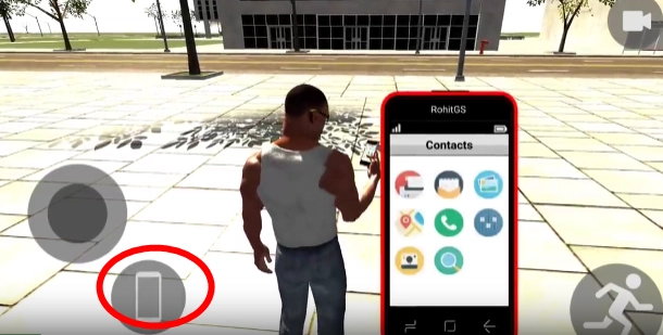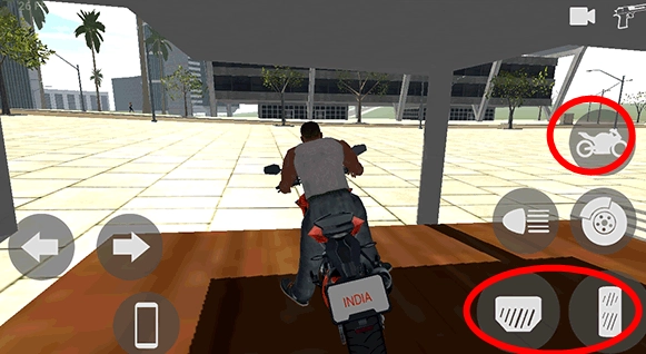 2、操控摇杆使人物移动到房子外并骑上摩托车,通过点击左右两侧的功能按钮来控制车辆。