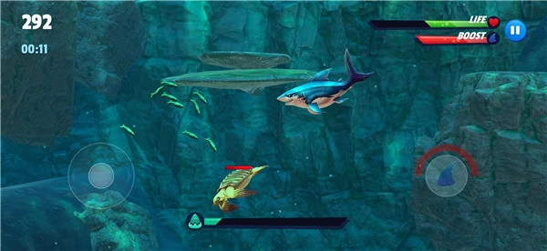 2、玩法核心是经典的大鱼吃小鱼机制,点击右侧按钮可操控鲨鱼加速,这一功能在追击猎物或躲避危险时都至关重要。