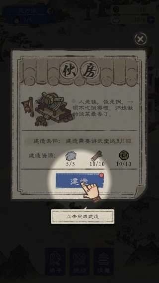 若想培养更多弟子,就得建一座伙房。伙房是用来制作食物的地方,升级伙房不仅能提升食物的存储上限,还能加快食物的恢复速度。