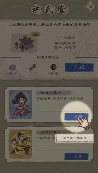 初期的屋舍建造完成后,没有弟子的话难免有些尴尬。所以接下来的时间,我打算去“讲武堂”招收一些弟子来增强门派的实力。操作方法很简单,只要点击“讲武堂”,就会出现相应的画面,里面有银牌招募令和金牌招募令。在初期阶段,这些招募令是……(此处原文可能存在表述不完整,暂按现有内容调整)