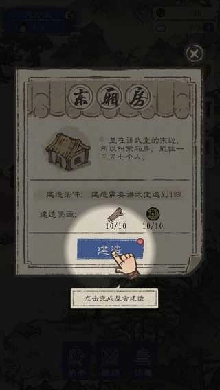 接下来建造一些屋舍供弟子们居住,在有“建筑”标签的地方,点击建造,之后便会出现不同屋舍的命名方式,如东厢房、西厢房等字样,这些命名的怀旧感,还是非常细节的,如图: