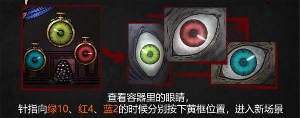 2、接着向左走,查看容器里的眼睛,会发现绿色眼睛有白光指向10,红色眼睛指向4,蓝色眼睛指向3。来到三个钟表的位置,等指针分别指向绿10、红4、蓝3时,依次按下黄框位置,即可进入新场景。