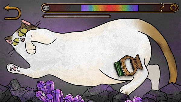 4、出来后和左边的男人对话,然后向右走会遇到一只白色猫咪,需要给它梳毛。梳毛时要来回拖动梳子,注意观察上方的彩色进度条——当猫咪的头处于有颜色的区域时,代表它此刻感到舒适(这个操作确实不太容易掌握,建议尽量让梳子在颜色区域内来回顺毛的时间长一些)。等舒适进度条完全填满后,猫咪就会去抓一只死老鼠送给我们。