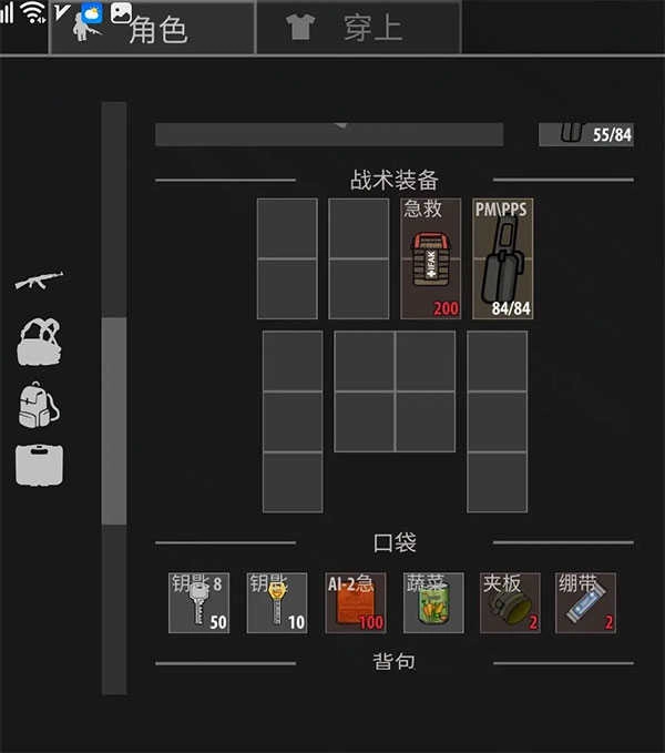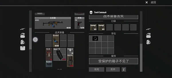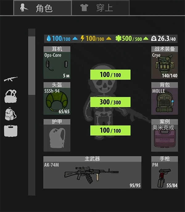 配置清单如下:头盔一顶,顶配级别的背包一个,少量药品,一罐蔬菜罐头,一把完全改装的PM手枪,外加额外一匣弹鼓。