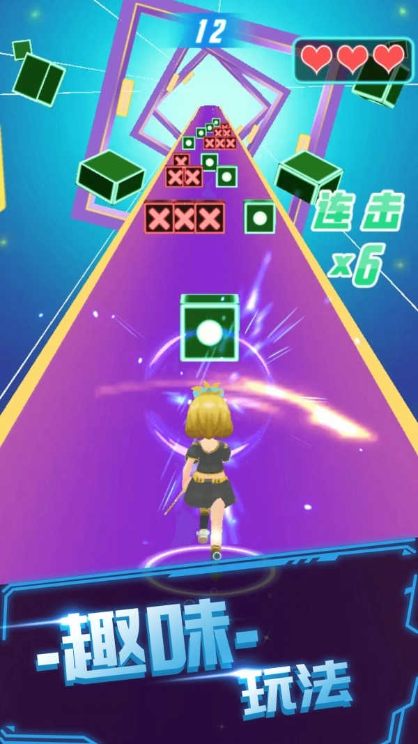 3.跟着音乐的节奏,通过左右滑动人物来挑选正确的方块,以此完成整首歌曲。