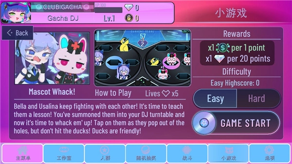 和打地鼠类似的玩法,在这个小游戏里,Bella和Usalina会从界面中DJ工作台左右两个碟子的6个孔里冒出来,其中还夹杂着鸭子。玩家在游戏里有5次生命值,要是漏打一次或者误打到鸭子就会扣掉一次生命值,生命值扣完游戏就结束了。Easy难度下,每得1分能获得2倍的Bits,每累计20分可以得到一个Gems;Hard难度下,每得1分只能获得1倍的Bits,同样是每累计20分获得一个Gems。