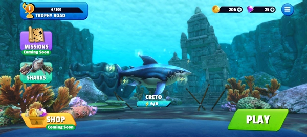 5、逐步解锁更多水下的凶猛野兽:灰鲭鲨、锤头鲨、虎鲨以及所向披靡的大白鲨!