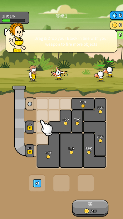游戏开始时,英雄会自动攻击,击败敌人可获得金币。优先攒金币购买方块,将其与初始武器合并,提升攻击力,快速消灭敌人,为后续关卡积累资源和优势。