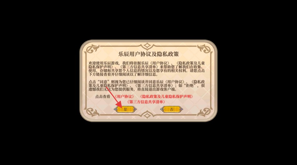在用户协议与隐私政策页面,点击【是】按钮以同意相关条款,从而继续进行游戏流程。