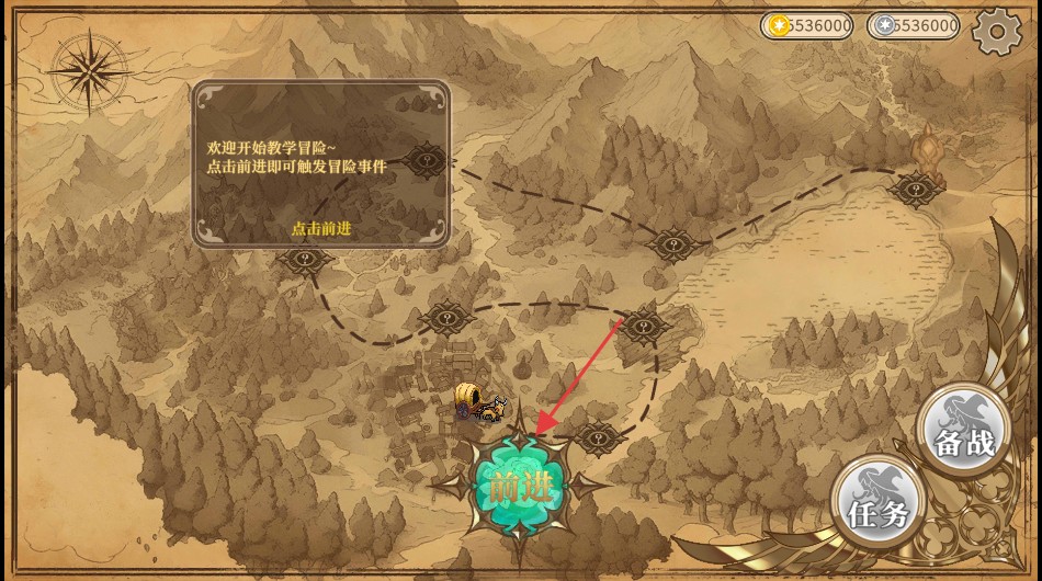 在教学冒险地图界面,点击【前进】按钮,即可触发冒险事件,开启教学关卡的体验流程。