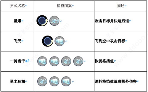 若星拥有两个能够主动改变自身格挡值的连招:BAA对应的“一骑当千”,可以消耗自身所有格挡值,为目标追加额外伤害;而AABB对应的“星尘狂澜”,在命中对手后,能让自身恢复全部格挡值。