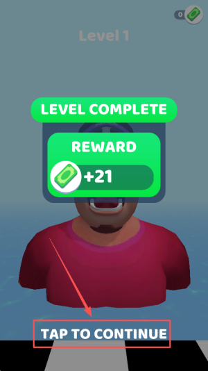 完成领奖环节:屏幕显示Level1 LEVEL COMPLETE REWARD +21,点击TAP TO CONTINUE即可开启下一轮挑战。