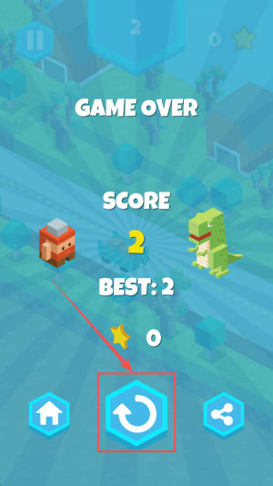 结算结束:显示GAME OVER SCORE 2 BEST:2,点击继续可重新挑战。