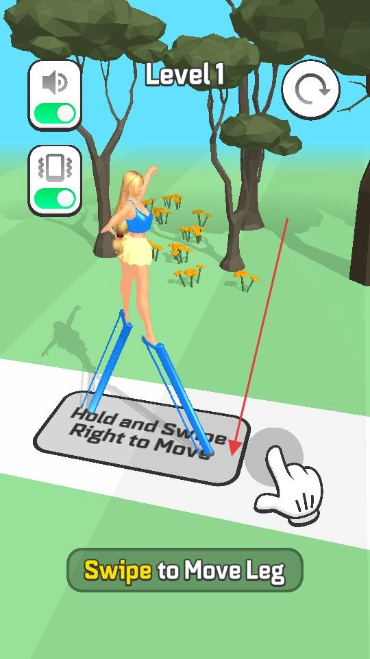 打开杂技高跟鞋,角色踩着蓝色高跷站在道路上,按照提示按住右侧区域并滑动,以此控制高跷移动,开启在林间道路的前行之旅。