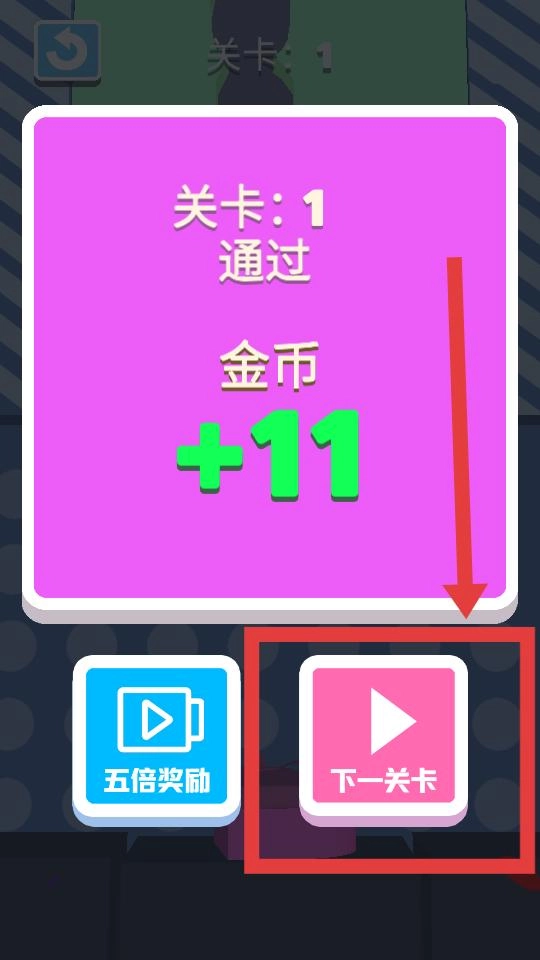 顺利闯过第一关后,界面上呈现出获得11枚金币的奖励提示,点击进入下一关的按钮就能继续进行游戏挑战。