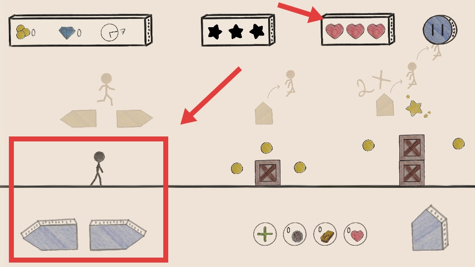 进入关卡后,操控黑色火柴人角色,利用下方道具,在场景中收集金币,躲避障碍,推进冒险。