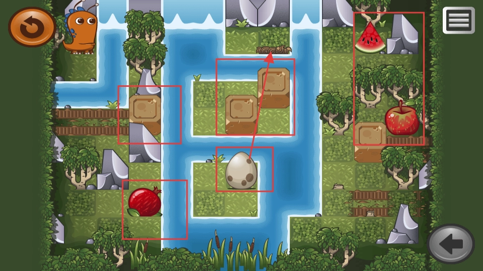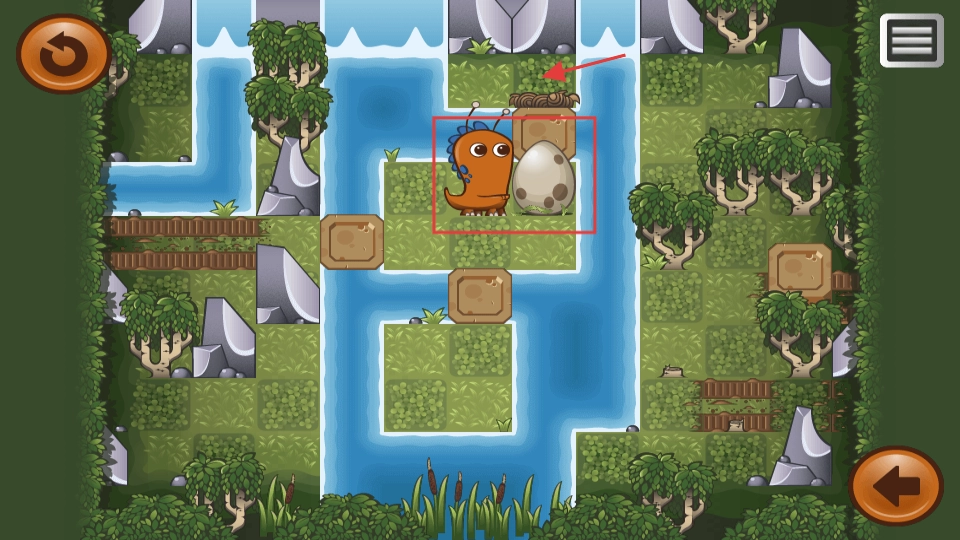 进入游戏后,操控橙色小恐龙在场景里移动,推动方块并调整其位置,为之后把蛋送到目标位置铺设好路径。
