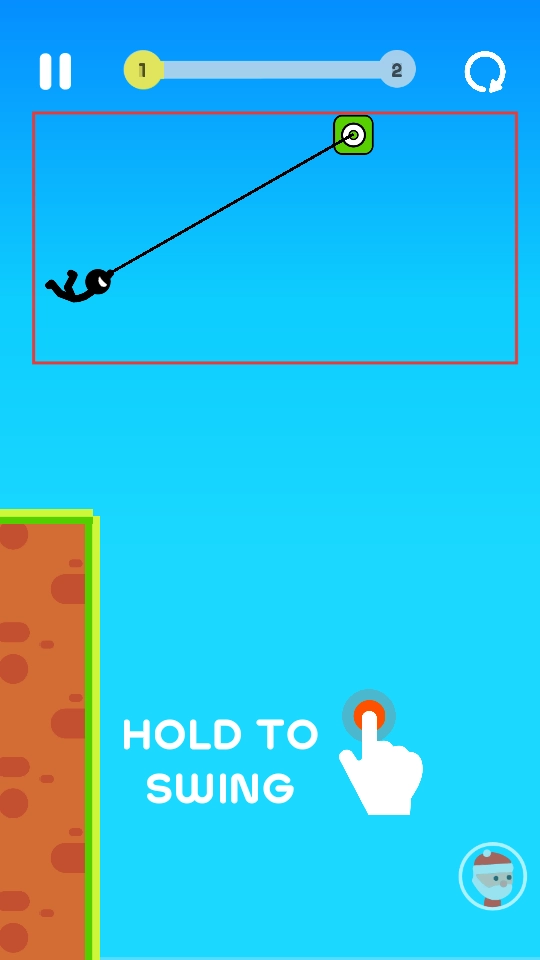 长按屏幕操控火柴人秋千摆动,借助惯性调整角度,松开手指使其跃起,越过下方障碍,准确落在平台上。