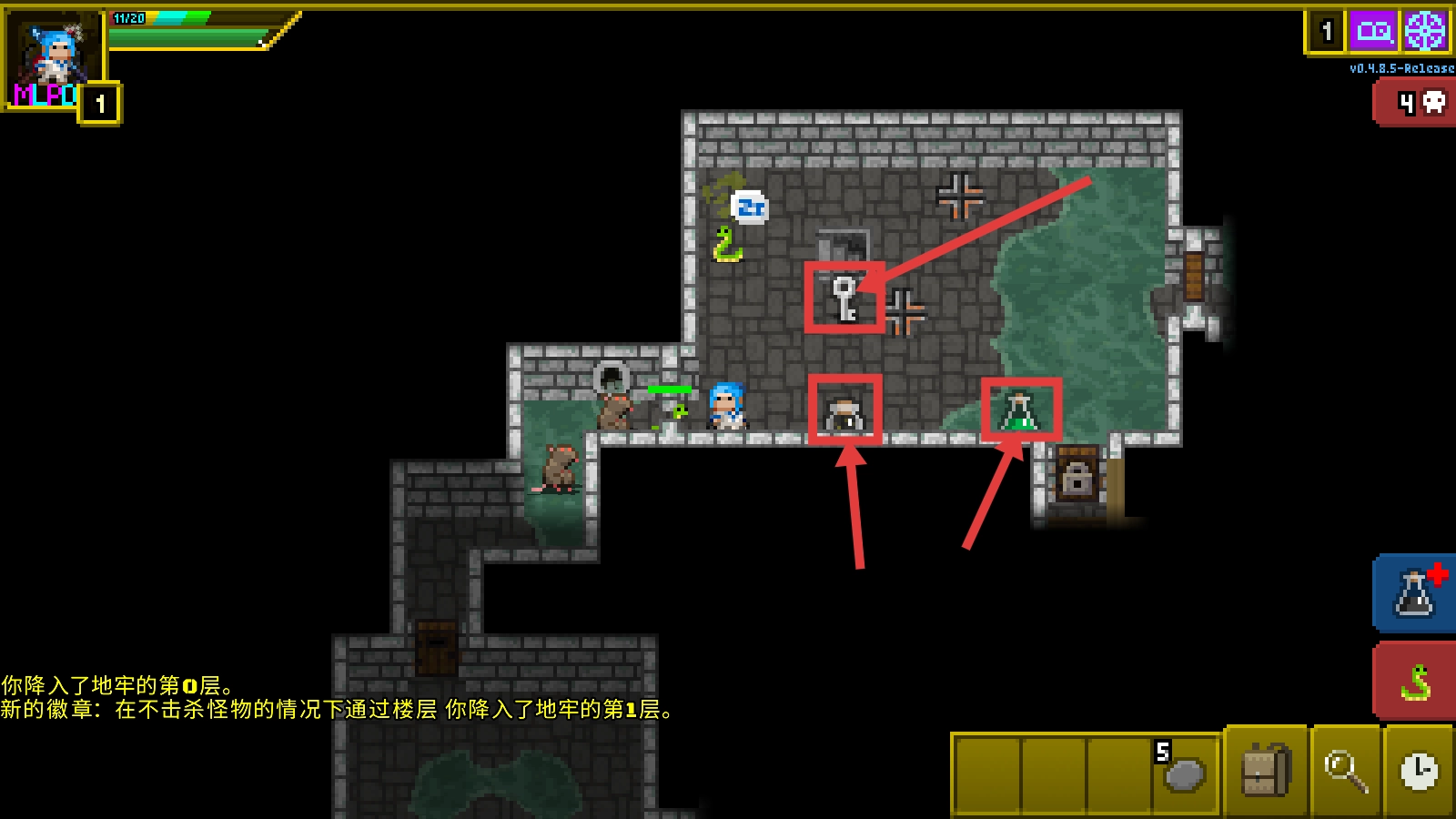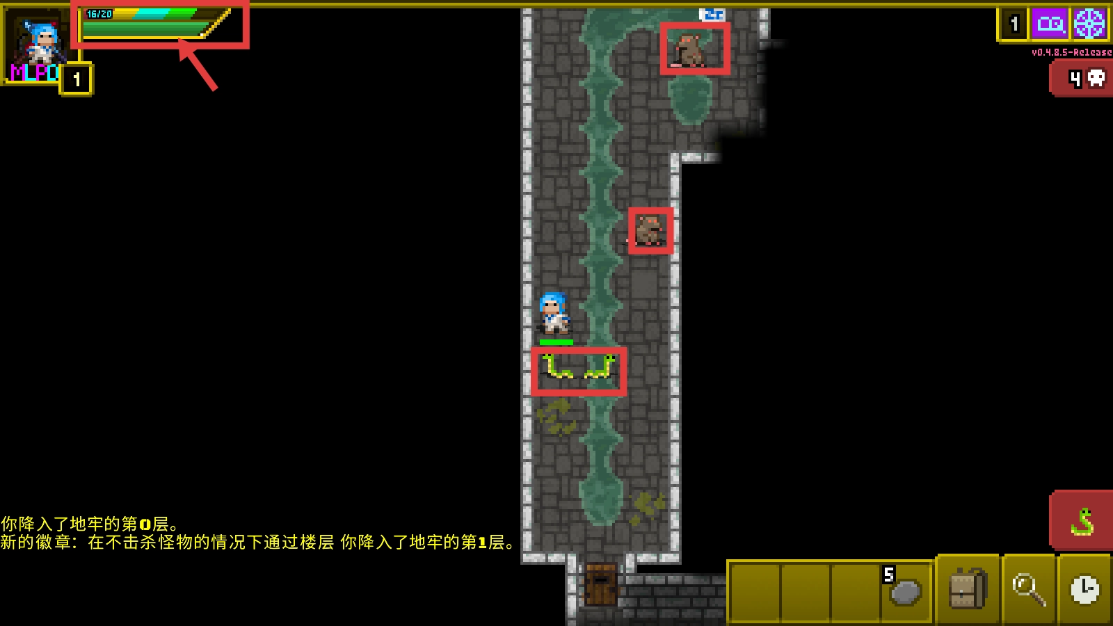 地牢第0层,注意【16/20-生命值】,避开老鼠与蛇类怪物,小心探索以防受伤。