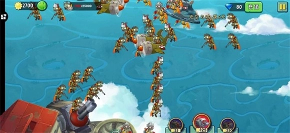9、一炮当关:本关里每种僵尸对应的分数各有不同,具体为普通僵尸30分、路障僵尸40分、铁桶僵尸50分、小型飞机僵尸60分、杨永信僵尸70分、双舱飞机僵尸300分、仲裁者僵尸450分、巨人僵尸2000分。对付小怪建议使用激光武器,遇到巨人僵尸则切换成炮来攻击,导弹在这关作用不大,只要累计打到足够的分数就能顺利通关。