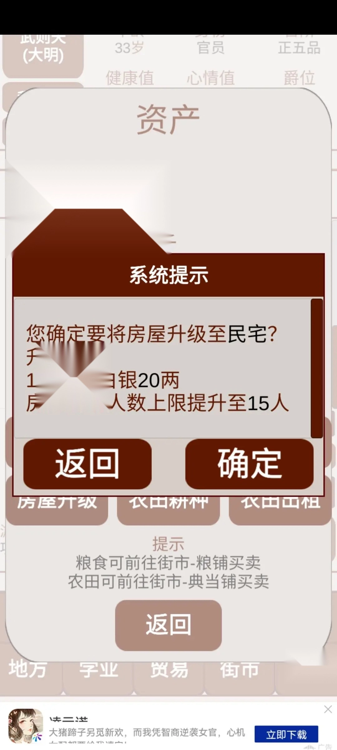 玩家死亡时会自动保存进度,若没有可继承家业的子嗣,就只能选择观看广告复活,否则游戏存档将永久失效。