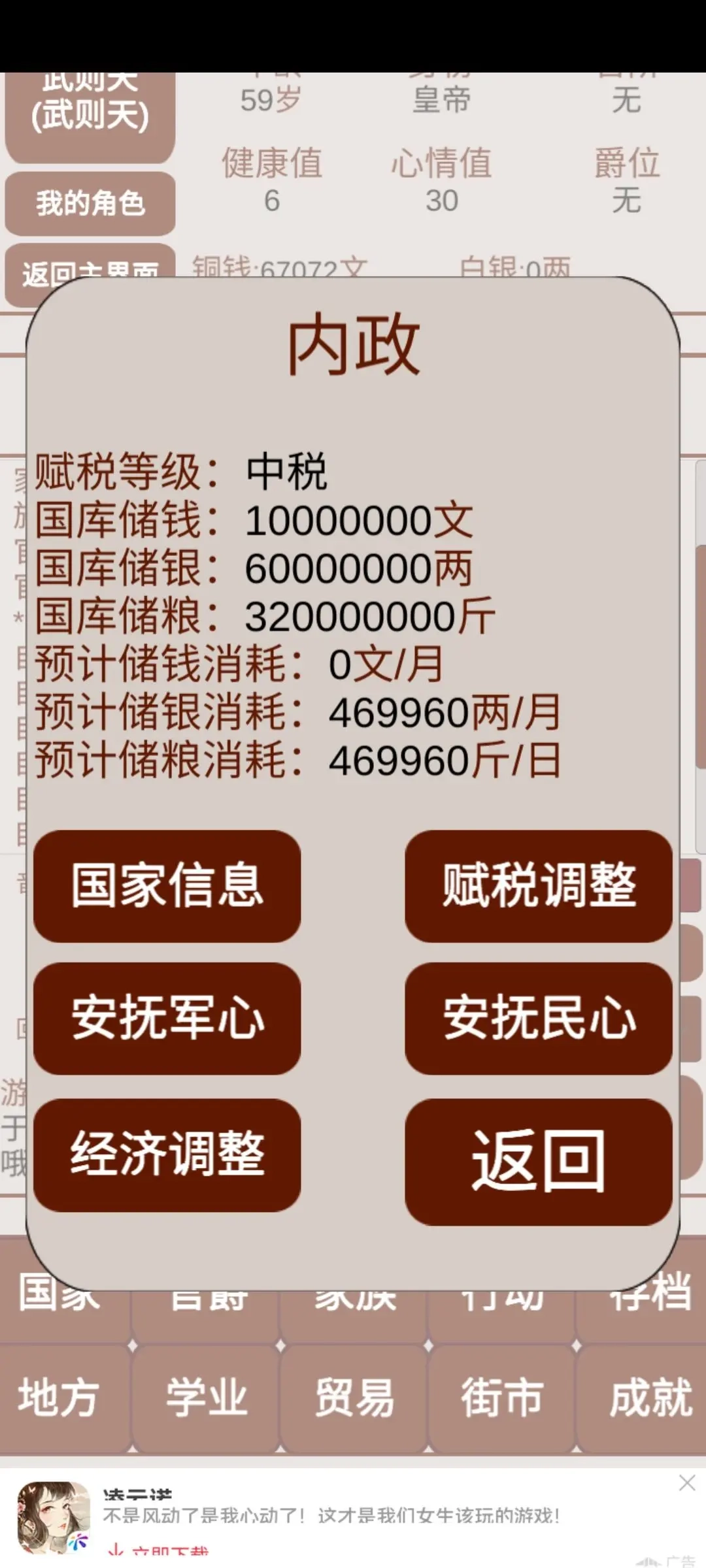月收税增加钱粮,军队消耗钱粮,目标是保证钱粮正收益,然后发展国力、扩建军队,把国内国外全占领。