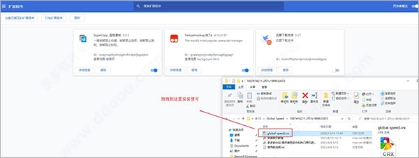 在扩展程序中,开启开发者模式,并将在本站下载的global-speed.crx插件直接拖拽到空白界面进行安装;