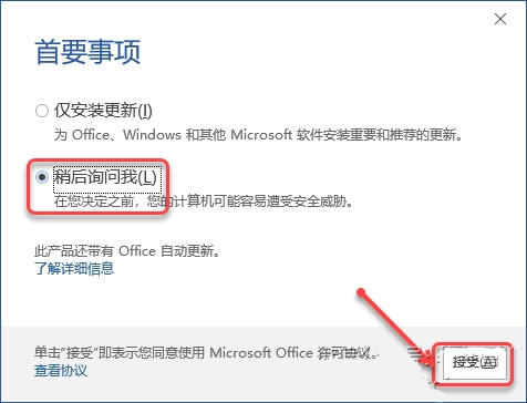 9、选择【稍后询问我】,点击【接受】;