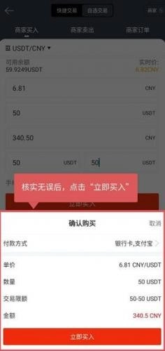 3、输入打算买入的USDT或比特币币种数量,也可直接输入相应需购买的法币数量。