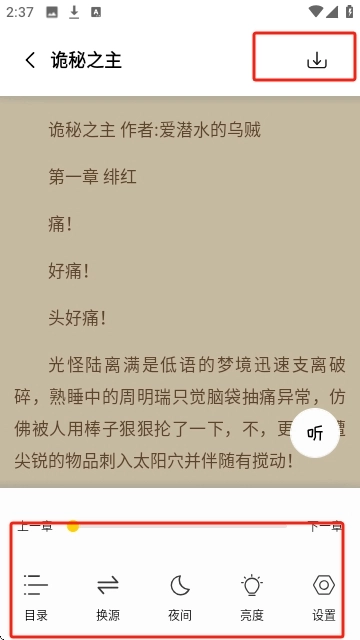 1. 在小说阅读界面轻点屏幕,右上角便会出现一个“↓”图标。