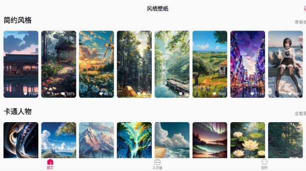 2、首页呈现简约风格、卡通人物等多种不同分类的壁纸,方便用户挑选。